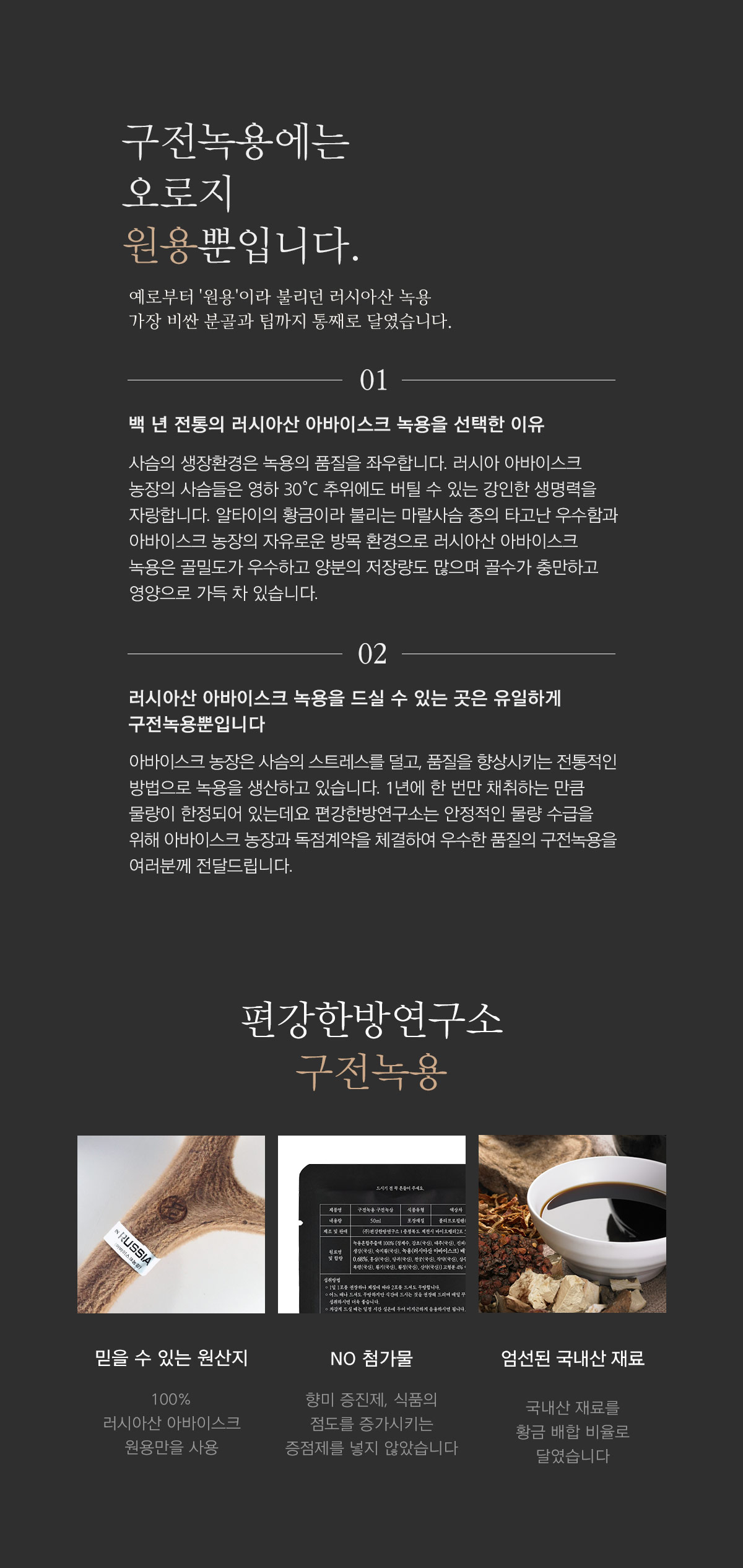 | 원재료명 및 함량 | 녹용혼합추출액 100% [ 정제수, 감초 (국산), 대추 (국산), 진피 (국산), 생강 (국산), 숙지황 (국산), 녹용 (러시아산 아바이스크) 배합함량 0.68%, 홍삼 (국산), 당귀 (국산), 천궁 (국산), 작약 (국산), 삽주 (국산), 복령 (국산), 황기 (국산), 황정 (국산), 산약 (국산) ] 고형분 4% 이상 |